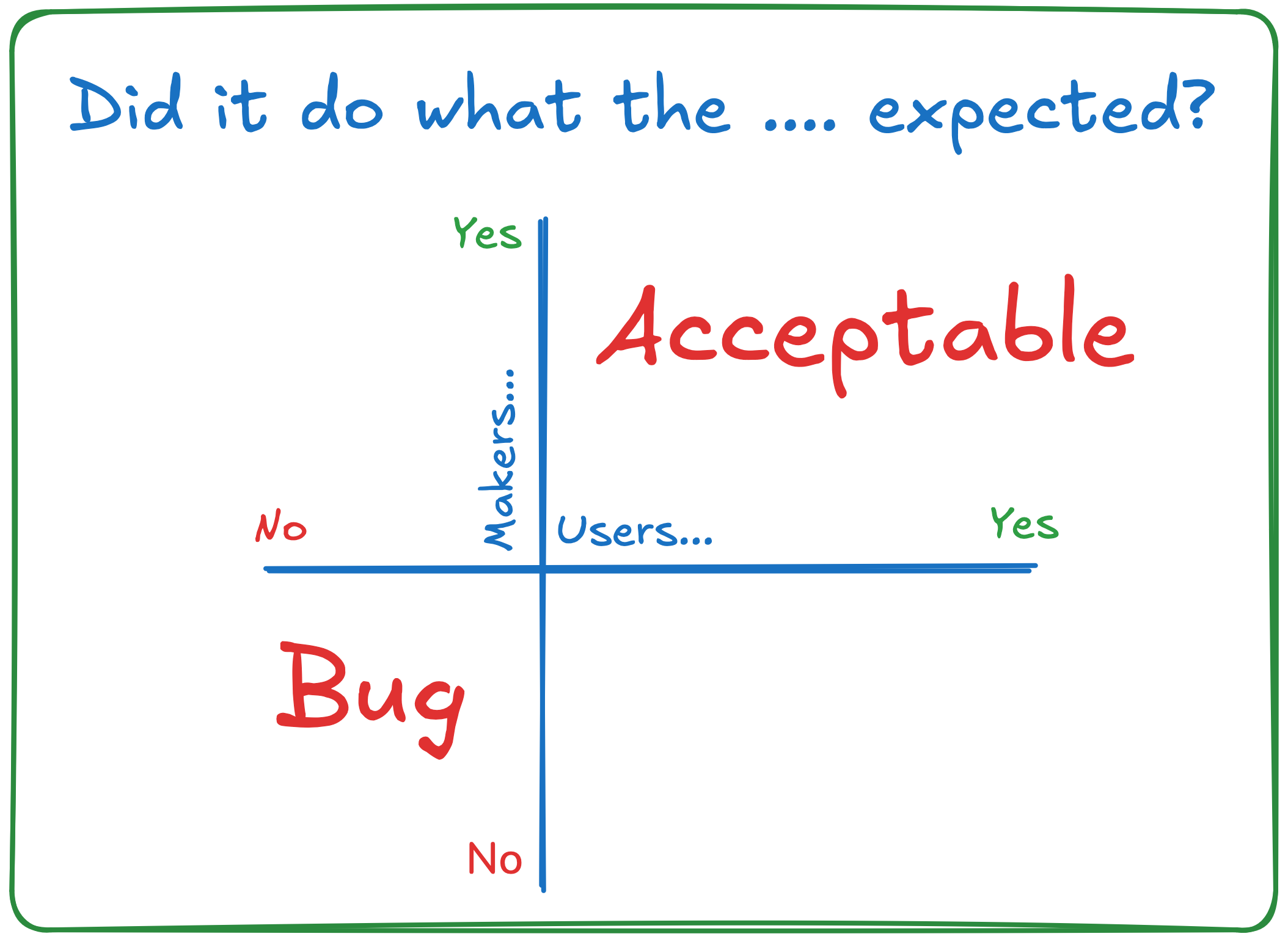 That, I think, is the missing piece of the puzzle. Expectations. But whose expectations? Different people expect different things. To keep things simple, let’s just consider two perspectives for now. Does the product do what the people making it (stakeholders, developers, product managers, testers…) expect? Does it do what the users expect? I assume some readers will feel their blood boiling now, and jump into saying that this is an oversimplification. There’s never been a company in the history of software development where stakeholders, developers, testers and product managers all expect the same things. But that’s not the problem we’re solving now, there are plenty of good solutions for that kind of alignment. Also, of course, different groups of users expect different things, but that’s not necessarily what we’re solving now also. So consider some group of users that expect the same thing, somewhere on the persona spectrum, and some group of people who make the product and got aligned somehow, just so we can clear out the extremes.