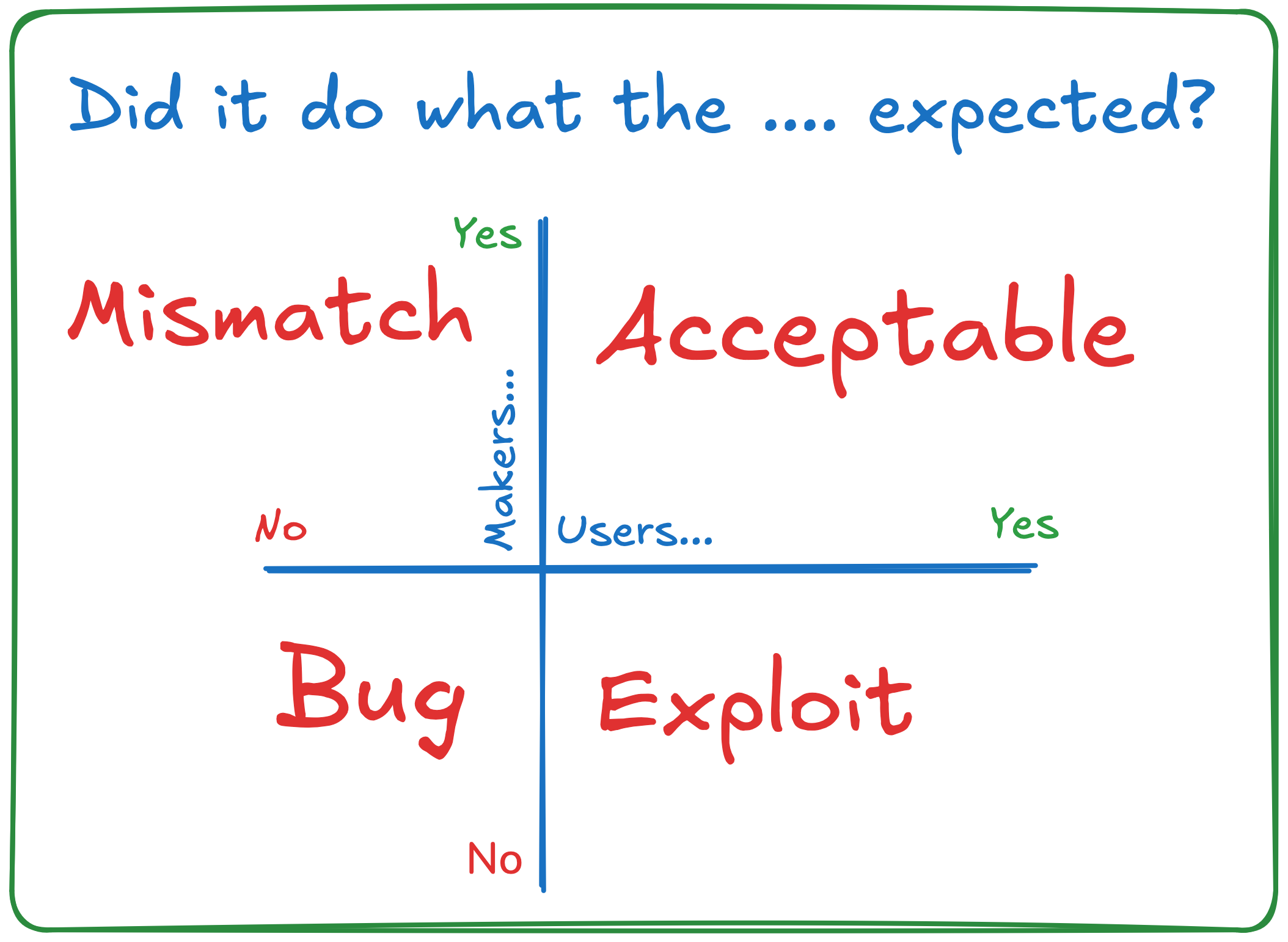 Instead of just considering right and wrong, there are 4 categories here: Bugs, Exploits, Acceptable and Mismatched functions. And of course, being a consultant, I can now claim that I invented a new model taken from the initial letters: BEAM.