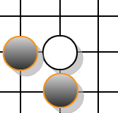 The exercise involved writing a piece of code to evaluate whether a stone in the Go game can be taken or not. The definition of whether a stone can be taken was given as it having only one ‘liberty’, with liberties defined as free horizontal or vertical places adjacent to the stone. For example, the white stone in the picture below has two liberties (diagonals don’t count) and it cannot be taken.